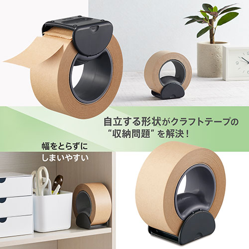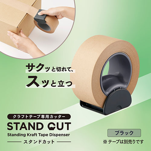 サクッと切れて、スッと立つ。切りやすくてしまいやすいクラフトテープカッター。自立する本体形状でクラフトテープの収納問題を解決。触れてもけがをしにくい安全な刃形状と握りやすい立体形状。テープカット時に握りこむとテープをロック&狙った位置でしっかりカットができます。