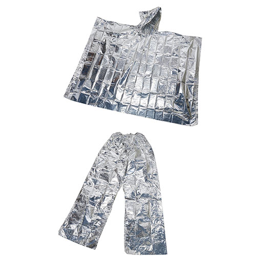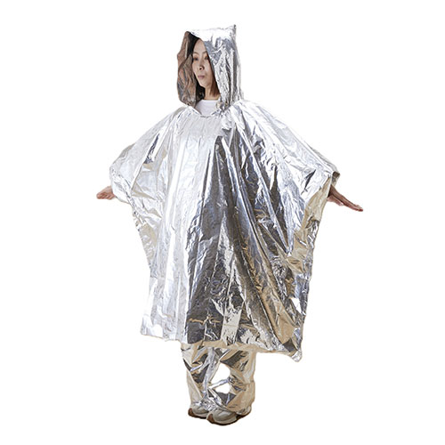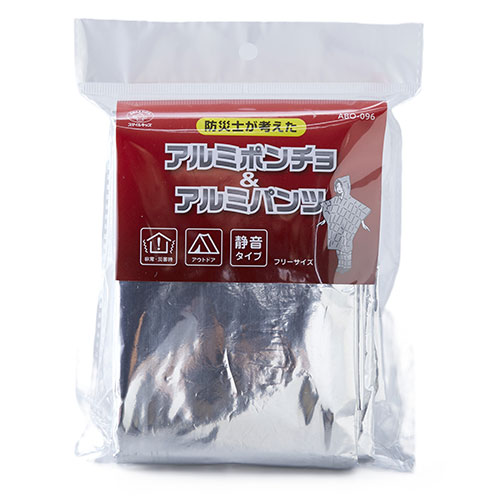 いざという時に暖をとれる、カサカサ音がしにくい静音加工仕様のアルミ製ポンチョとパンツのセット品です。薄手のアルミ素材のため、防災セットに入れやすくコンパクトに保管できます。