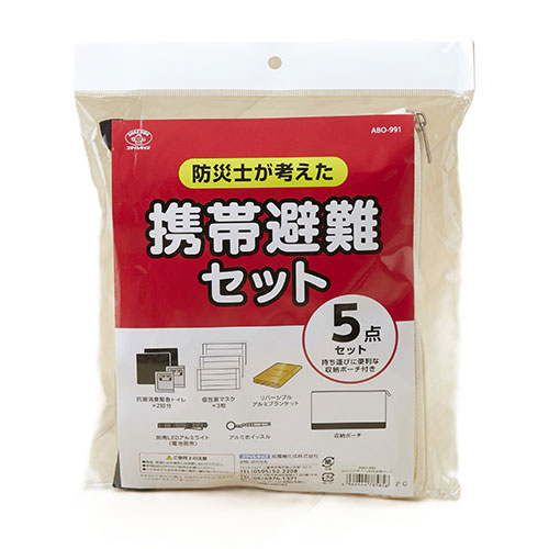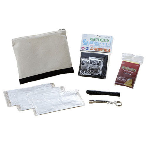 携帯しやすい避難セットです。ポーチ付きで、家の中や車など、お好きな場所に保管できます。