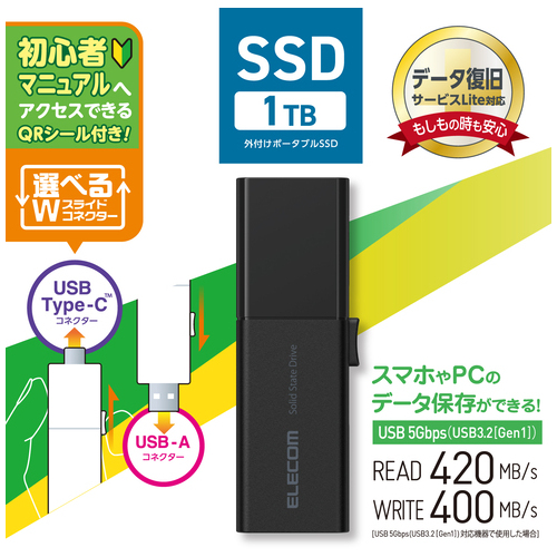 USB Type-A/Cコネクター対応外付けポータブルSSD。