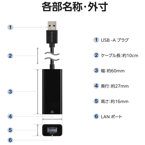 ●外形寸法(幅)[mm]:60●外形寸法(奥)[mm]:27●外形寸法(高)[mm]:16●質量[g]:26●ケーブル長:10cm●インターフェース:USB 5Gbps/2.0/1.1●色:ブラック●規格:IEEE802.3ab/IEEE802.3u/IEEE802.3/IEEE802.3x●仕様:デバイス側:USB Type-A(オス)×1ポート●種別:Type-A ●最小出荷単位: 1