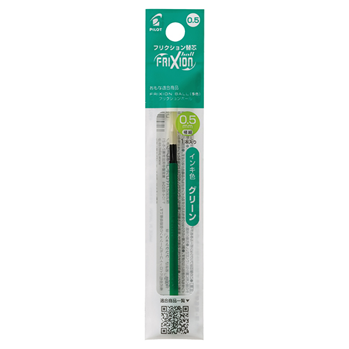 ●ボール径[mm]:0.5●インク色:グリーン(-G)●本体長[mm]:87.5●軸寸法(径)[mm]:3.6●インク種類:フリクションインキ●種別:替芯●製造国:日本●注意事項:筆跡が乾いてから、専用ラバーで消去してください。高温になる場所に置かないでください。60℃以上でインキや筆跡が無色になります。-10℃前後になると消去した筆跡が戻る場合があります。公文書・宛名書き・保存用文書には使用しないでください。 ●最小出荷単位: 1