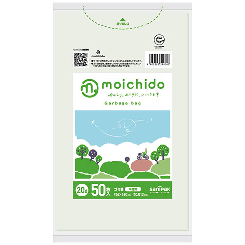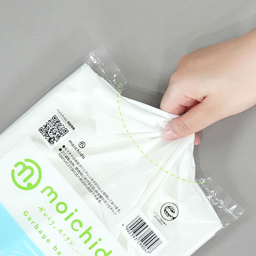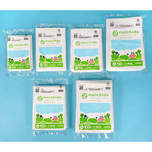 moichidoモイチドは、再生ポリエチレンを40%以上使用した環境に配慮したゴミ袋です。「もう一度使う」ということから「moichidoモイチド」となりました。ポリエチレンにリサイクル原料40%以上、天然ライムストーン20%以上配合しています。天然ライムストーンを用いたマスターバッチを使用し、nocooの製造時の端材も使用することで、ゴミ袋製造時、燃焼時におけるCO2排出量がポリエチレン100%のゴミ袋と比べ約20%削減できるゴミ袋です。