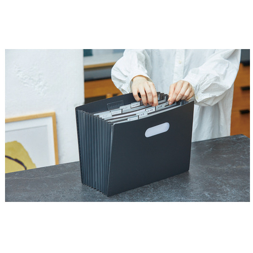 整理収納アドバイザーのプロ集団「おうちデトックス社」監修の厚手の材質でガバッと開いて自立するドキュメントファイル。交互カラーの仕切りで書類へのアクセス性◎。用途にあわせて選べるフタ付きタイプとオープンタイプの2種展開。(オープンタイプ)