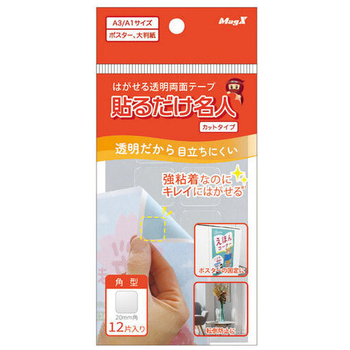 ●入数:12片●使用可能壁面材質:ガラス、プラスチック、金属、塗装木面、紙●サイズ:20mm角●質量:8g●繰り返し使用:可●色:透明●使用不可壁面:ゴム、シリコン●種別:カットタイプ●材質:アクリル系粘着剤●原産国:中国●注意事項:紙など接着面によっては剥がす際に素材が破損する場合があります●使用可能温度:0℃~40℃ ●最小出荷単位: 1
