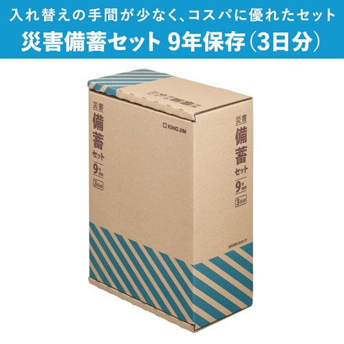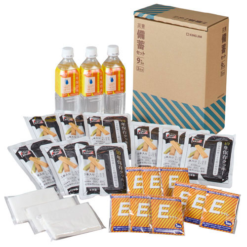 賞味期限が9年と長く、コスパに優れたセットです。長期間保存により、入れ替えの手間も削減できます。500mlの飲料水やクッキー、簡易トイレなどが3日分、A4ファイルサイズの個装箱にコンパクトに収まっており、キャビネットやデスクのわずかなスペースで防災用品を備蓄できます。