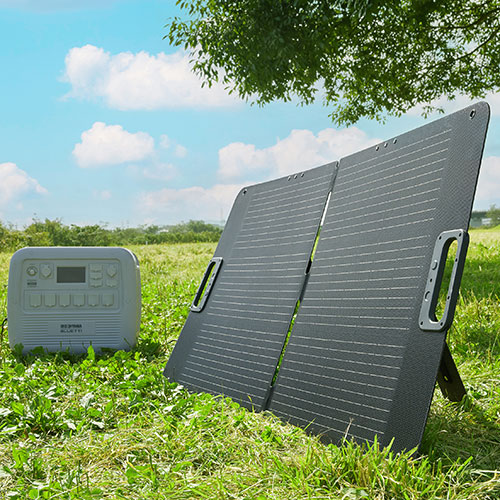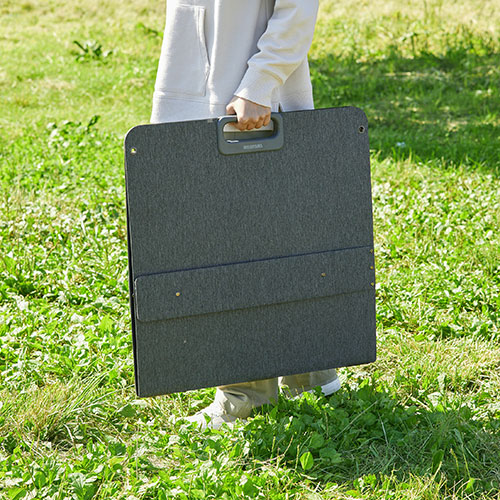 アウトドアシーンや災害時など電源を確保しにくい場面でも、ポータブル電源(アイリスオーヤマ製ポータブル電源PS720AA・PS2000AA)に電力を蓄えることができます。単結晶パネルを採用しているため、太陽光エネルギーからの変換効率が22%とロスを抑えて発電します。最大100W出力で電気を供給します。IP67に対応。防塵性能は最高レベルの「レベル6」で粉塵が内部に侵入せず、防水性能は「レベル7」で雨天時の使用も可能です(いずれも端子部分は除く)。本体にブラケットが付いているので、太陽の向きに合わせて90°まで調整可能です。折りたたみ可能で、ハンドルが付いているので持ち運びも便利です。側面の収納ポケットにMC4コネクタが収納されています。