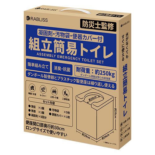 ●セット内容:便座、便器、凝固剤5回分、汚物袋X5枚、便器カバー×1枚●個装(幅×奥×高):340×375×60mm●個装重量:800g●耐荷重:約250kg●材質:凝固剤=高吸水性ポリマー●原産国:中国 ●最小出荷単位: 5