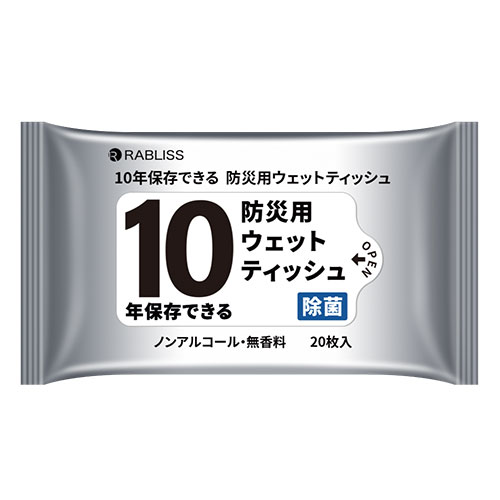 10年保存できる、防災用ウェツトティシュ。未開封で製造日より10年長期保存が可能。除菌、ノンアルコール・無香料。20枚入りです。