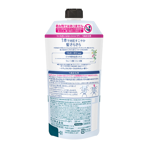 ●販売名:メリット リンスインシャンプー かえ 320ml●寸法:188.0 x 87.0 x 53.0 [ミリメートル]●種別:つめかえ●内容量:320mL●入数:24袋●まとめ買い●液性:弱酸性●有効成分:成分:グリチルリチン酸ジカリウム*、水、ポリオキシエチレンラウリルエーテル硫酸アンモニウム(1E.O.)液、ラウレス硫酸Na、ラウリン酸アミドプロピルベタイン液、ラウリルヒドロキシスルホベタイン液、エタノール、ジステアリン酸グリコール、POEステアリルエーテル、グリセリンモノイソデシルエーテル、高重合ジメチコン-1、塩化トリメチルアンモニオヒドロキシプロピルヒドロキシエチルセルロース、塩化ポリプロピレングリコールヒドロキシプロピルトリモニウムセルロース液(2P.O.)、塩化ジメチルジアリルアンモニウム・アクリルアミド共重合体液、濃グリセリン、ユーカリエキス、カモミラエキス-1、レンゲソウエキス、アスナロ抽出液、シラカバエキス、DL-リンゴ酸、ヤシ油脂肪酸エタノールアミド、ラウリン酸、ステアリン酸POEソルビタン、POE(3)ラウリルエーテル、POE(4)ラウリルエーテル、POE(25)ラウリルエーテル、PPG、BG、軽質流動イソパラフィン、無水エタノール、水酸化ナトリウム液、水酸化カリウム液(A)、エデト酸塩、フェノキシエタノール、安息香酸塩、香料 *は「有効成分」無表示は「その他の成分」●香り:ナチュラルフローラルのやさしい香り●製造国:日本●注意事項:ご注意●頭皮に傷、湿疹等異常のある時は使わないでください●刺激等の異常が出たら使用を中止し、皮フ科医へ相談してください●ポンプを押す時や使用中、目に入らないよう注意し、入った時は、すぐに充分洗い流してください●子供や認知症の方などの誤飲等を防ぐため、置き場所に注意してください●医薬部外品:該当 ●最小出荷単位: 1