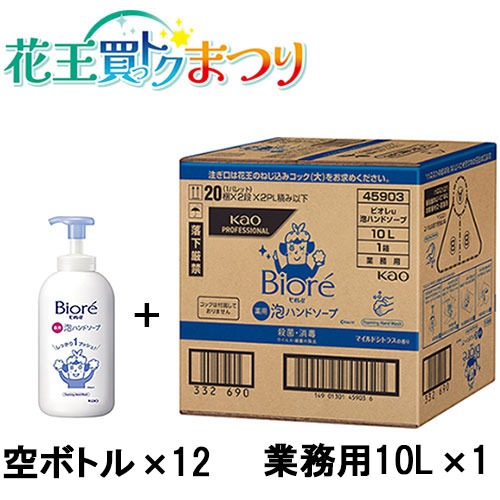 【花王買っトクまつり!セット品が今だけオトク!/2026年4月15日まで(※販売状況によって、キャンペーン期間中に販売が終了になる可能性がございます)】空ボトル12本と、ビオレu泡ハンドソープつめかえ(業務用)10L×1箱のセットです。