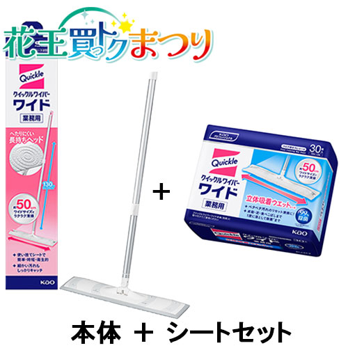 【花王買っトクまつり!セット品が今だけオトク!/2026年4月15日まで(※販売状況によって、キャンペーン期間中に販売が終了になる可能性がございます)】クイックルワイパー ワイド(業務用)本体と、立体吸着ウェットシートのセットです。ヘッドが床面にしっかりフィットし、細かい汚れもシート全面で取り込んでキャッチします。幅約50cmのワイドヘッドと、長さ130cmのロングサイズの柄で、広いスペースや手の届かない隙間もラクラク清掃できます。へたりにくいヘッドで、長くお使いいただけます。使い捨てシートで簡単・時短・衛生的。99%除菌(*)&消臭。香りが残らないタイプ。*すべての菌を除菌するわけではありません。