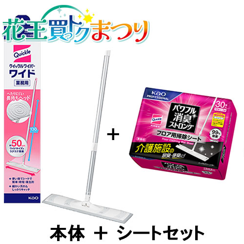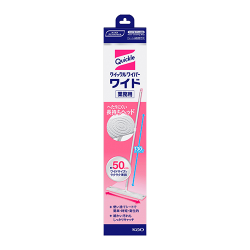【花王買っトクまつり!セット品が今だけオトク!/2026年4月15日まで(※販売状況によって、キャンペーン期間中に販売が終了になる可能性がございます)】クイックルワイパー ワイド(業務用)本体と、パワフル消臭ストロング フロア用掃除シートのセットです。ヘッドが床面にしっかりフィットし、細かい汚れもシート全面で取り込んでキャッチします。幅約50cmのワイドヘッドと、長さ130cmのロングサイズの柄で、広いスペースや手の届かない隙間もラクラク清掃できます。へたりにくいヘッドで、長くお使いいただけます。使い捨てシートで簡単・時短・衛生的。床掃除と共にニオイ・消臭対策。