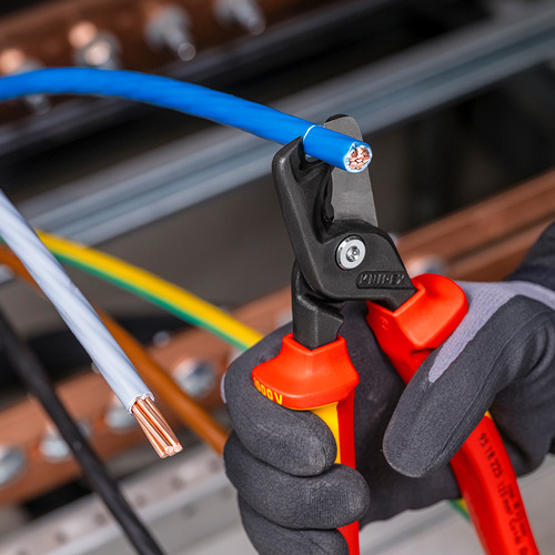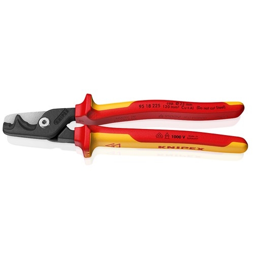 ●メーカー…KNIPEX(クニペックス) ●型番…95 18 225 ●全長…225mm ●切断能力…銅単線・アルミケーブル:35mm2 撚線:70mm2 細撚線:120mm2 ●ハンドル…コンフォート(1000V絶縁) ●仕上げ…磨き ●硬度…HRC56 ●重量…457g ●先端の刃で予備切断し、根元の刃で追加の切断ができます。 ●先端刃はスリム形状のため狭所での切断も可能。 ●ケーブルを潰さずに切断します。 ●刃は焼き入れされ、精密研削されています。 ●挟み込み防止により、指が挟まれるのを防ぎます。 ●調整可能な強力ボルトジョイントで滑らかな切断が可能 ●銅・アルミケーブル用※ACSRなどの鋼心ケーブルには使用できません ●参考在庫数・商品詳細・サイズ情報はメーカー(参考)URLからもご確認いただけます。 ●最小出荷単位: 1
