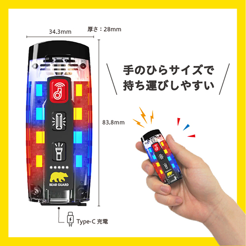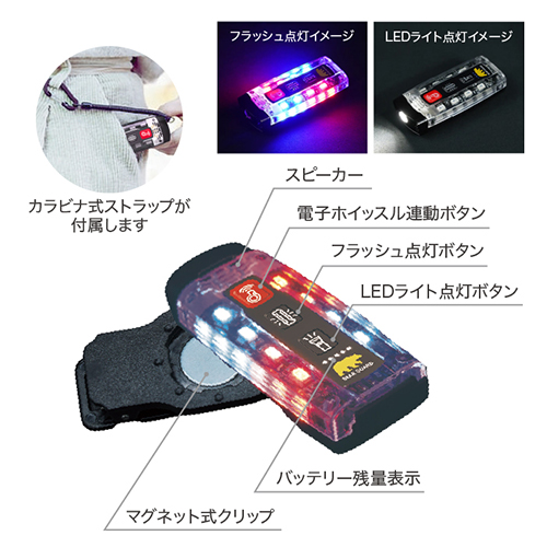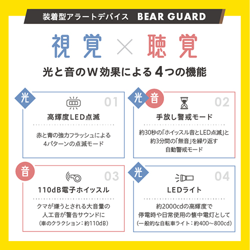 光と音で「クマを遠ざける」。赤と青の強力フラッシュ点滅による視覚的警戒と、110dBの警告音による聴覚的警戒とを組み合わせた、次世代の装着型アラードデバイスです。クマが本能的に警戒する光と音によって人の存在を早期に知らせることで、不意の遭遇リスクを低減することを目的としています。日常使用できるLEDライト機能、居場所を知らせる防災用、警戒ブザー音で護身用などとしても活用できる多目的モデル。着脱可能なマグネットクリップ、カラビナ式ストラップにより、様々な装着が可能です。