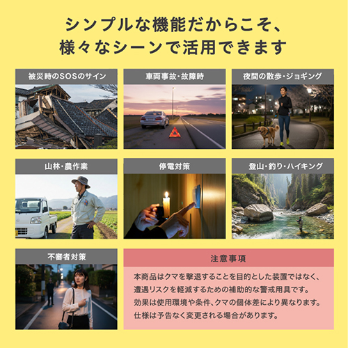 ●基本の4機能:1)高輝度LED点滅、2)手放し警戒モード、3)110dB電子ホイッスル、4)LEDライト●本体×1、充電ケーブル×1、ストラップ×1、取扱説明書×1●LED光度:1600~2000cd●LED点滅:4パターン●ホイッスル音:110dB●使用時間:LED連続点滅 約8時間●電池種類:充電式リチウムイオン電池●電池残量表示:5段階●バッテリー定格:3.7V//600mAh●充電方式:USB Type-C●充電アダプタ定格:5V 1A以上●防水等級:生活防水(IP65)●装着方法:クリップ/ストラップ/マグネット●保証期間:購入から1年●本商品はクマを撃退することを目的とした装置ではなく、遭遇リスクを軽減するための補助的な警戒用具です。 ●最小出荷単位: 10