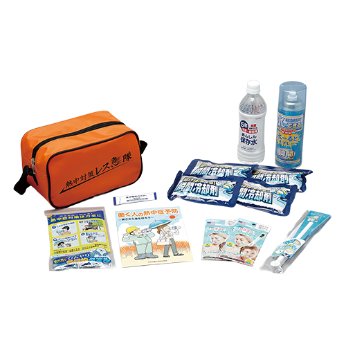●寸法:幅250×奥行140×高さ150mm●質量:1.5kg●セット内容:収納ポーチ×1、叩けば冷える瞬間冷却剤×4、液晶体温計フラットミニ×2、水分補給パウダーW-AID(ダブルエイド)×1(賞味期限:12カ月以上)、ひんやり多目的タオル×1、あんしん保存水500mL×1(賞味期限:48カ月以上)、防滴扇子×1、氷ーるどスプレー420mL×1、『暑さから身を守ろう 働く人の熱中症予防』(中央労働災害防止協会)※ロットにより内容品が同等品に変更となる可能性がございます。ご了承ください。※高温多湿環境で保管すると「叩けば冷える瞬間冷却剤」中の薬剤が固まることがありますのでご注意ください。 ●最小出荷単位: 1