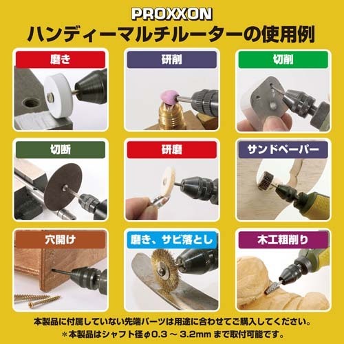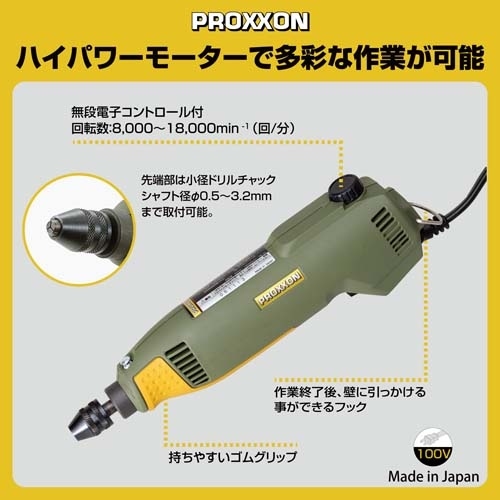 ●メーカー…キソパワーツール ●型番…28473 ●ブランド名…プロクソン(PROXXON) ●用途…切削、各種磨き、サビ落とし、穴あけ、切断、研磨 ●消費電力…50W ●回転数…8,000~18,000回/分 無段電子コントロール付き ●ドリルチャック…φ0.5mm~3.2mm ●定格使用時間…15分 ●本体サイズ…220(W)×45(D)×50(H)mm ●重量…500g ●付属品…・ドリル(ハイス)φ0.3/0.5/0.8/1.0/1.2/1.5/2.0/2.5/3.0/3.2mm 各1本 ・ワイヤーブラシ(真鍮ディスク)1枚 ・切断砥石 5枚、純毛バフ(ディスク)2枚 ・純毛バフ(軸付き)2種 各1本 ・彫金バフ 1枚 ・軸付き砥石(WA)2種 各1本 ・フラップホイールペーパー120番 1本 ・ハイスビット2種 各1本、専用シャフト 2本 ・専用ビットケース 1個 ●トルクが強く、ハードな作業にも適応。 ●チャック部が小径ドリルチャックなので異なる軸径サイズの先端ビットの交換が簡単。 ●※付属のφ0.3mmのドリルを使用する際は、φ0.3mmのドリルを掴むことのできる市販ピンバイス等をご使用ください。 ●二重絶縁構造 ●参考在庫数・商品詳細・サイズ情報はメーカー(参考)URLからもご確認いただけます。 ●最小出荷単位: 1