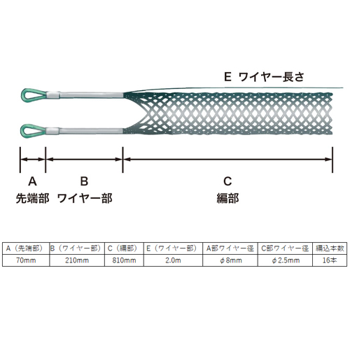 ●メーカー…ミノル工業 ●型番…MC80060M ●用途…各種電線ケーブルのけん引作業に ●作業引張強度…15.9kN(1620kgf) ●ケーブルサイズ…φ49~60mm ●全長…1090mm ●メッシュ長…810mm ●材質…ワイヤー部:スチール(メッキワイヤー) ロック部:アルミ ●スッポ抜けしない!しっかりつかんで安全グリップ ●長尺ケーブルの途中から装着可能 ●【使用方法】 ・縫い合わせワイヤーで綴じ込んで使用します。 ・縫い合わせワイヤーが解けないよう、開口部分を2~3回巻いてください。 ・縫い合わせ後、グリップを軽くしごいてケーブに密着させてから、尾端を針金かビニールテープなどでバインドしてください。 ●※ケーブル挿入時の全長は10%~30%短くなります。 ●参考在庫数・商品詳細・サイズ情報はメーカー(参考)URLからもご確認いただけます。 ●最小出荷単位: 1