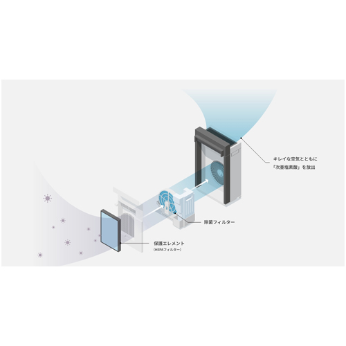次亜塩素酸で空気を洗って、清潔除菌、洗浄脱臭できます。 次亜塩素酸のチカラで清潔加湿、花粉・ハウスダストも徹底除去します。