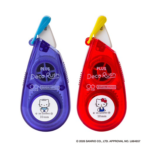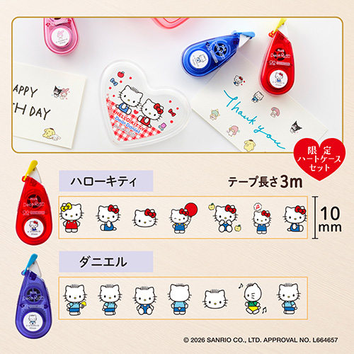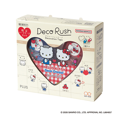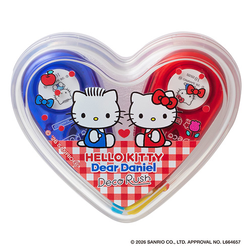 ●柄名:ハローキティ&ダニエル ●使い切りタイプ ●製品外形寸法:デコラッシュ= W58×D18×H26mm、ハートケース=W73.5mm×D61mm×H25.5mm ●テープ幅10mm ●テープ長さ3m ●材質 デコラッシュ本体ケース=ポリスチレン(PS)、ハートケース=ABS樹脂 ●単品パッケージ寸法:W85×D27×H76 mm ●入り数:9/144 ●最小出荷単位: 9