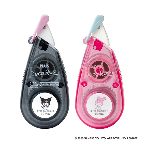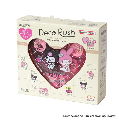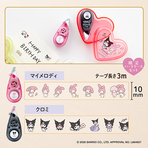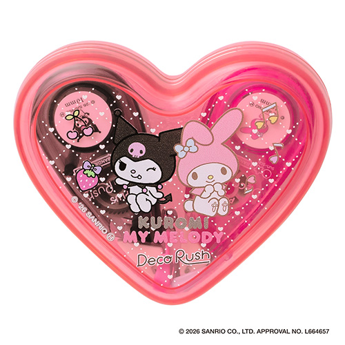 ●柄名:マイメロディ&クロミ ●使い切りタイプ ●製品外形寸法:デコラッシュ= W58×D18×H26mm、ハートケース=W73.5mm×D61mm×H25.5mm ●テープ幅10mm ●テープ長さ3m ●材質 デコラッシュ本体ケース=ポリスチレン(PS)、ハートケース=ABS樹脂 ●単品パッケージ寸法:W85×D27×H76 mm ●入り数:9/144 ●最小出荷単位: 9