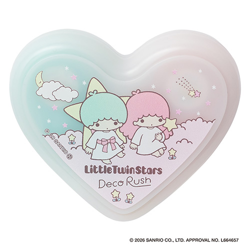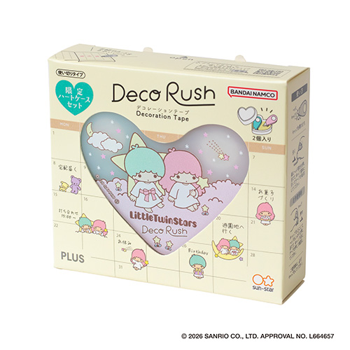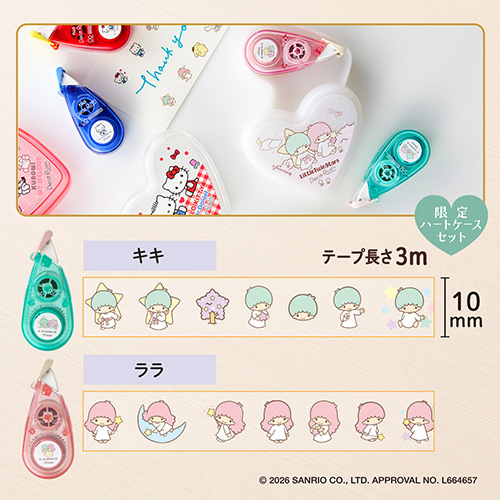 ●柄名:キキ&ララ ●使い切りタイプ ●製品外形寸法:デコラッシュ= W58×D18×H26mm、ハートケース=W73.5mm×D61mm×H25.5mm ●テープ幅10mm ●テープ長さ3m ●材質 デコラッシュ本体ケース=ポリスチレン(PS)、ハートケース=ABS樹脂 ●単品パッケージ寸法:W85×D27×H76 mm ●入り数:9/144 ●最小出荷単位: 9