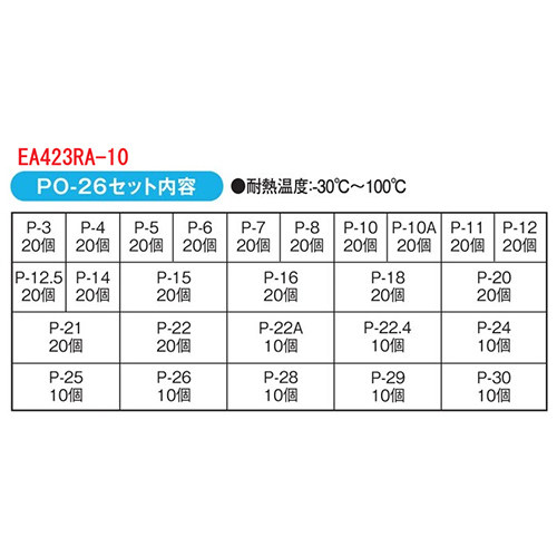 ●<セット内容>…JIS番号 / 内径 / 線径 (入数):P-3 / 2.8 / 1.9 (20)P-4 / 3.8 / 1.9 (20)P-5 / 4.8 / 1.9 (20)P-6 / 5.8 / 1.9 (20)P-7 / 6.8 / 1.9 (20)P-8 / 7.8 / 1.9 (20)P-10 / 9.8 / 1.9 (20)P-10A / 9.8 / 2.4 (20)P-11 / 10.8 / 2.4 (20)P-12 / 11.8 / 2.4 (20)P-12.5 / 12.3 / 2.4 (20)P-14 / 13.8 / 2.4 (20)P-15 / 14.8 / 2.4 (20)P-16 / 15.8 / 2.4 (20)P-18 / 17.8 / 2.4 (20)P-20 / 19.8 / 2.4 (20)P-21 / 20.8 / 2.4 (20)P-22 / 21.8 / 2.4 (20)P-22A / 21.7 / 3.5 (10)P-22.4 / 22.1 / 3.5 (10)P-24 / 23.7 / 3.5 (10)P-25 / 24.7 / 3.5 (10)P-26 / 25.7 / 3.5 (10)P-28 / 27.7 / 3.5 (10)P-29 / 28.7 / 3.5 (10)P-30 / 29.7 / 3.5 (10)●材質…ニトリルゴム2種●耐油●ケースサイズ…280×187×41mm●総重量…492g●参考在庫数・商品詳細・サイズ情報はメーカー(参考)URLからもご確認いただけます。 ●最小出荷単位: 1